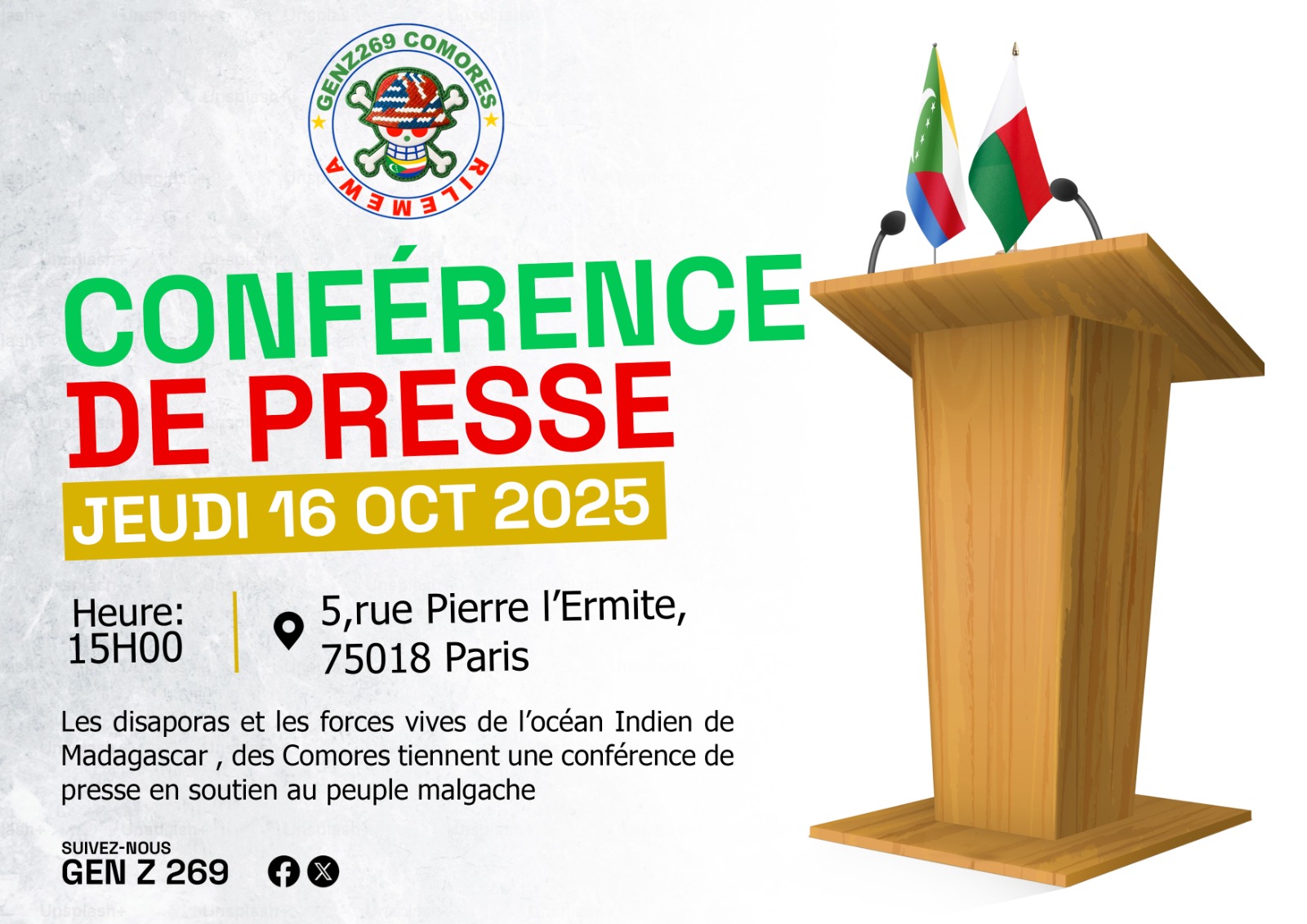 Les représentants des diasporas et forces vives de l’océan Indien, notamment malgaches et comoriennes, vont tenir une conférence de presse conjointe ce jeudi 16 octobre 2025 à Paris pour exprimer leur soutien au peuple malgache et dénoncer la décision de l’Union africaine de suspendre Madagascar de ses instances.