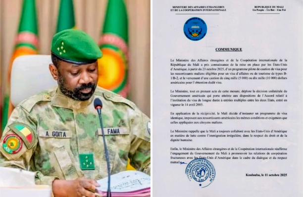 Dans un communiqué officiel, le ministère des Affaires étrangères et de la Coopération internationale indique que Washington mettra en œuvre, à compter du 23 octobre 2025, un programme pilote de caution de visa destiné aux Maliens sollicitant un visa d’affaires (B-1/B-2) ou de tourisme. Le dispositif prévoit le dépôt d’une caution comprise entre 5 000 et 10 000 dollars américains, remboursable sous certaines conditions à la fin du séjour.